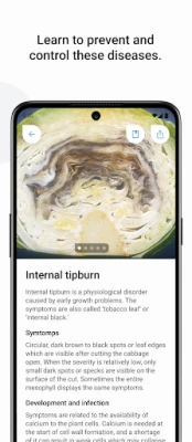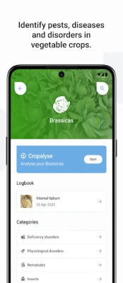 De kern van Cropalyser is een intuïtieve diagnostische tool die u middels gerichte vragen door een proces leidt om specifieke onregelmatigheden te identificeren. Of het nu gaat om verdachte symptomen, afwijkende groei of de dreiging van ongedierte, de app helpt u bij het nauwkeurig vaststellen van de oorzaak. De uitgebreide database van Cropalyser omvat gedetailleerde informatie over een breed scala aan problemen, van bacteriële en schimmelziekten tot virussen, insecten, nematoden en zelfs fysiologische stressfactoren, compleet met visuele voorbeelden en beschrijvingen van hun ontwikkelingsstadia.