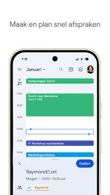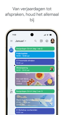 Optimaliseer uw dag en breng rust in uw planning met Google Agenda. Deze intuïtieve app integreert naadloos met uw digitale leven, herkent intelligent evenementen uit uw Gmail – van vluchtreserveringen tot concertkaartjes – en voegt deze automatisch toe aan uw kalender. Ervaar een perfect gesynchroniseerde weergave van al uw verplichtingen, of u nu Google Agenda op uw Android-telefoon, tablet, Wear OS-apparaat of desktop gebruikt. Uw agenda is altijd up-to-date en toegankelijk via hetzelfde Google-account, zodat u nooit een belangrijke afspraak mist. Bovendien combineert Google Agenda moeiteloos al uw planningen, inclusief andere kalenders zoals Exchange, in één helder overzicht.