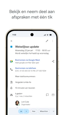 Als onderdeel van Google Workspace tilt Google Agenda samenwerken naar een hoger niveau. Vereenvoudig hybride vergaderingen door direct een Google Meet-videogesprek aan elke agenda-afspraak toe te voegen. Voor professionals biedt het toegang tot geavanceerde boekingspagina's, waarmee cliënten en patiënten moeiteloos afspraken kunnen inplannen. Plan teamvergaderingen efficiënt door de beschikbaarheid van collega's te controleren en hun agenda's over elkaar heen te leggen voor een optimaal tijdstip. Voeg uw werklocatie toe zodat collega's uw aanwezigheid kunnen zien en gemakkelijk afspraken kunnen plannen. Verrijk afspraken met notulen, leesmateriaal of andere essentiële documenten, zodat iedereen goed voorbereid aan een vergadering begint. Met de robuuste privacy- en beveiligingsfuncties van Google gebruikt u Google Agenda met volledig vertrouwen.