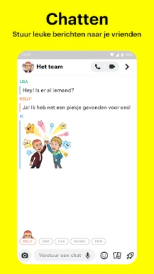 Duik in de wereld van Snapchat, waar visuele communicatie centraal staat. De app opent direct met de camera, zodat je moeiteloos een moment vastlegt met een snelle tik voor een foto of een ingedrukte knop voor een video. Geef je uiting aan je creativiteit met een breed scala aan Lenzen, Filters en persoonlijke Bitmoji's, en ontdek dagelijks nieuwe, unieke Lenzen die de bloeiende Snapchat-community creëert. Het is dé plek om je authenticiteit te delen en te zien wat er speelt in de wereld van je vrienden.