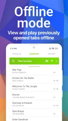 Geniet van ultiem gemak en naadloze toegang tot uw muziek. Eerder geopende tabs zijn ook offline beschikbaar, waardoor u altijd en overal kunt blijven oefenen. Navigeer moeiteloos door uw favoriete nummers en ontdek nieuwe inspiratie. De geschiedenisfunctie geeft direct toegang tot recent bekeken tablaturen, terwijl u met 'Favorieten' snel uw meest geliefde stukken oproept. Deze favorieten synchroniseren bovendien automatisch met de Songsterr-website, voor een consistente ervaring op al uw apparaten.